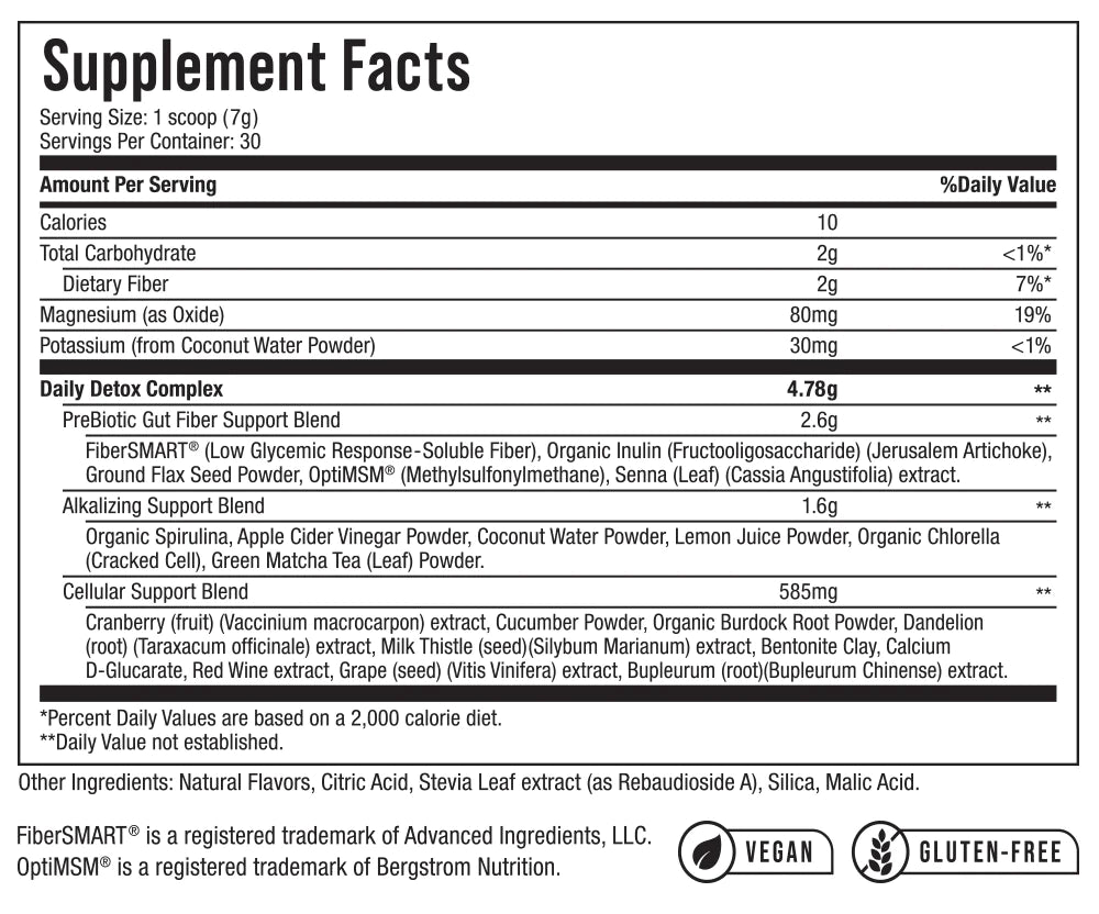 Introducing DAILY DETOX by NU-TEK Nutrition®. This comprehensive, powdered formula contains three key blends: a Prebiotic Gut Fiber Support Blend, an Alkalizing Blend, and a Cellular Detox Support Blend. With hand-selected selected ingredients like FiberSmart®, Ground Flax Seed, Cranberry, Apple Cider Vinegar, Lemon Juice, Milk Thistle and Green Matcha Tea, this easy-to-mix powder can become a new weapon in your daily health and wellness arsenal to help you feel invigorated, renewed, and refreshed.